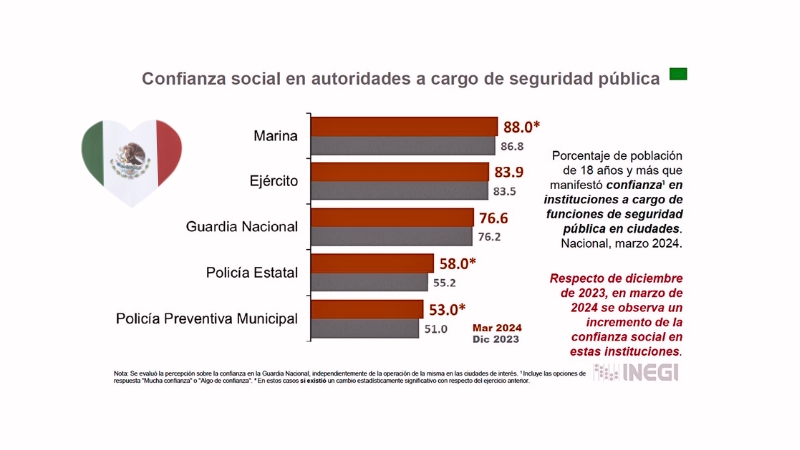 Este incremento se acompaña de una confianza robusta en las fuerzas de seguridad del país. El informe revela que un 88% confía en la Marina, seguida de un 83% en el Ejército y un 76% en la Guardia Nacional. Sin embargo, la confianza en las policías estatales se sitúa en un 58%.