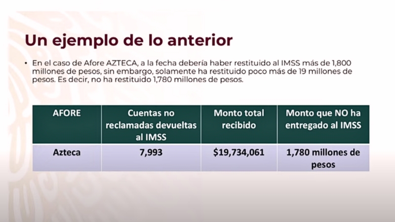 «Afore Azteca, como parte de Banco Azteca, propiedad de Ricardo Salinas Pliego, tiene una deuda pendiente con el IMSS que asciende a más de 1,800 millones de pesos. Esta cantidad debería haber sido restituida al Instituto desde que se implementó la reforma en 2020», afirmó López Obrador durante la conferencia.